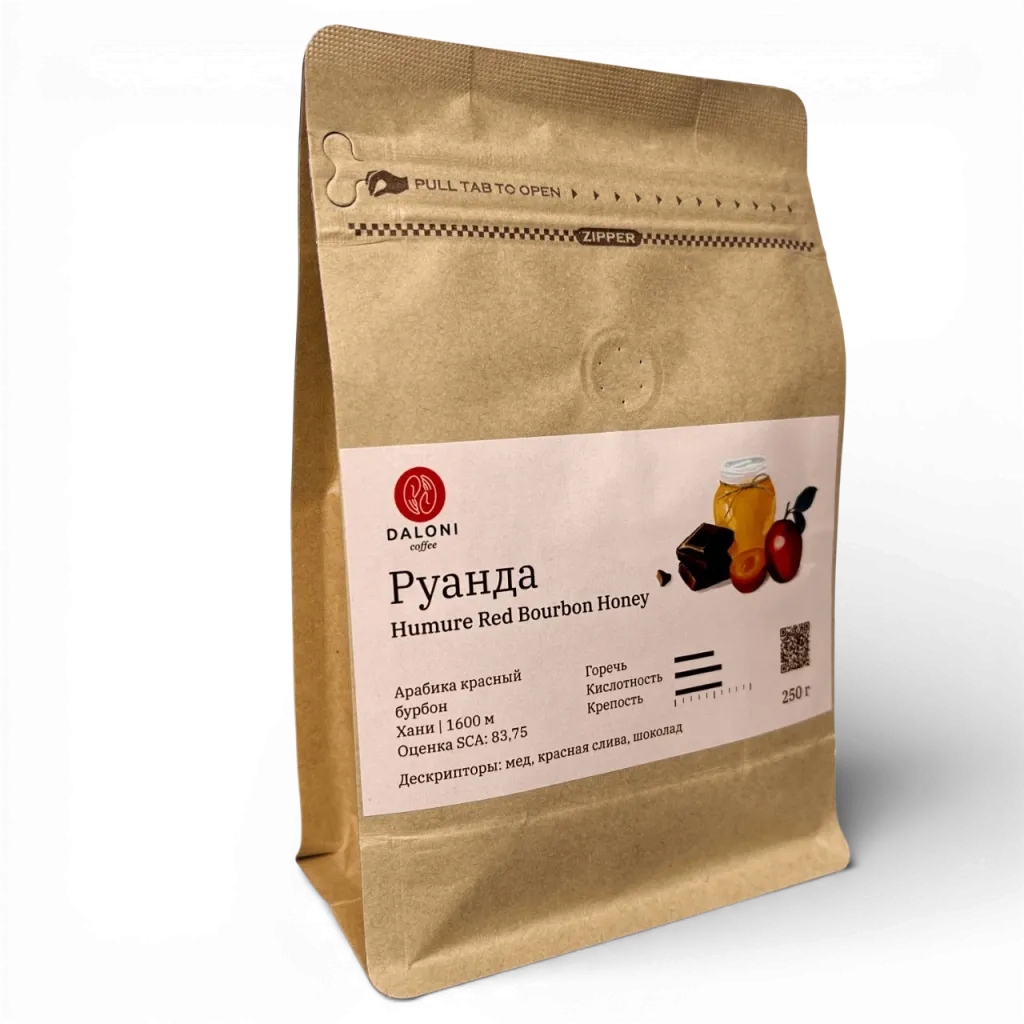 Кофе Daloni Rwanda Humure Red Bourbon Honey — арабика сорта Red Bourbon из региона Humure в Руанде, выращенная на 1600 м над уровнем моря. Honey-обработка, за которую отвечают женщины: снимают кожу, сушат с мякотью для сладости и фруктовости — чище натурального, слаще мытого. Оценка SCA 83.75 подтверждает качество. Вкусовой профиль округлый: мед, красная слива, шоколад, с акцентами какао. Аромат фруктово-медовый, тело плотное и бархатистое, кислинка умеренная.