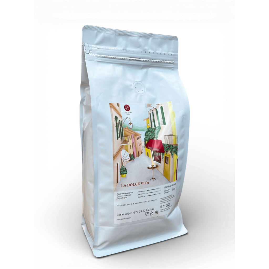 La Dolce Vita — ароматная и крепкая арабика тёмной обжарки, вдохновлённая итальянской кофейной культурой. Дескрипторы: горький шоколад, красное сухое вино, лесной орех. Свежеобжарка Daloni в Минске.