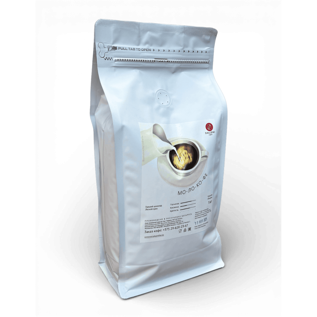 «Мо-ло-ко-фе» — фирменный бленд 100% арабики, созданный для тех, кто любит кофе с молоком. Плотный вкус, дескрипторы: какао, горький шоколад, лесной орех. Свежеобжарка Daloni в Минске.