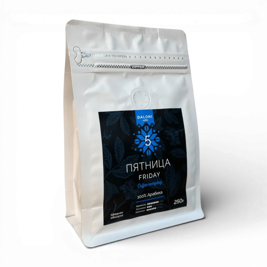 Кофе «Пятница» — это плотная и терпкая смесь 100% арабики мытой обработки, собранной в Центральной и Южной Америке. В аромате — жареный миндаль, выдержанный ром и чернослив. Вкус насыщенный, с пряным характером и долгим послевкусием.